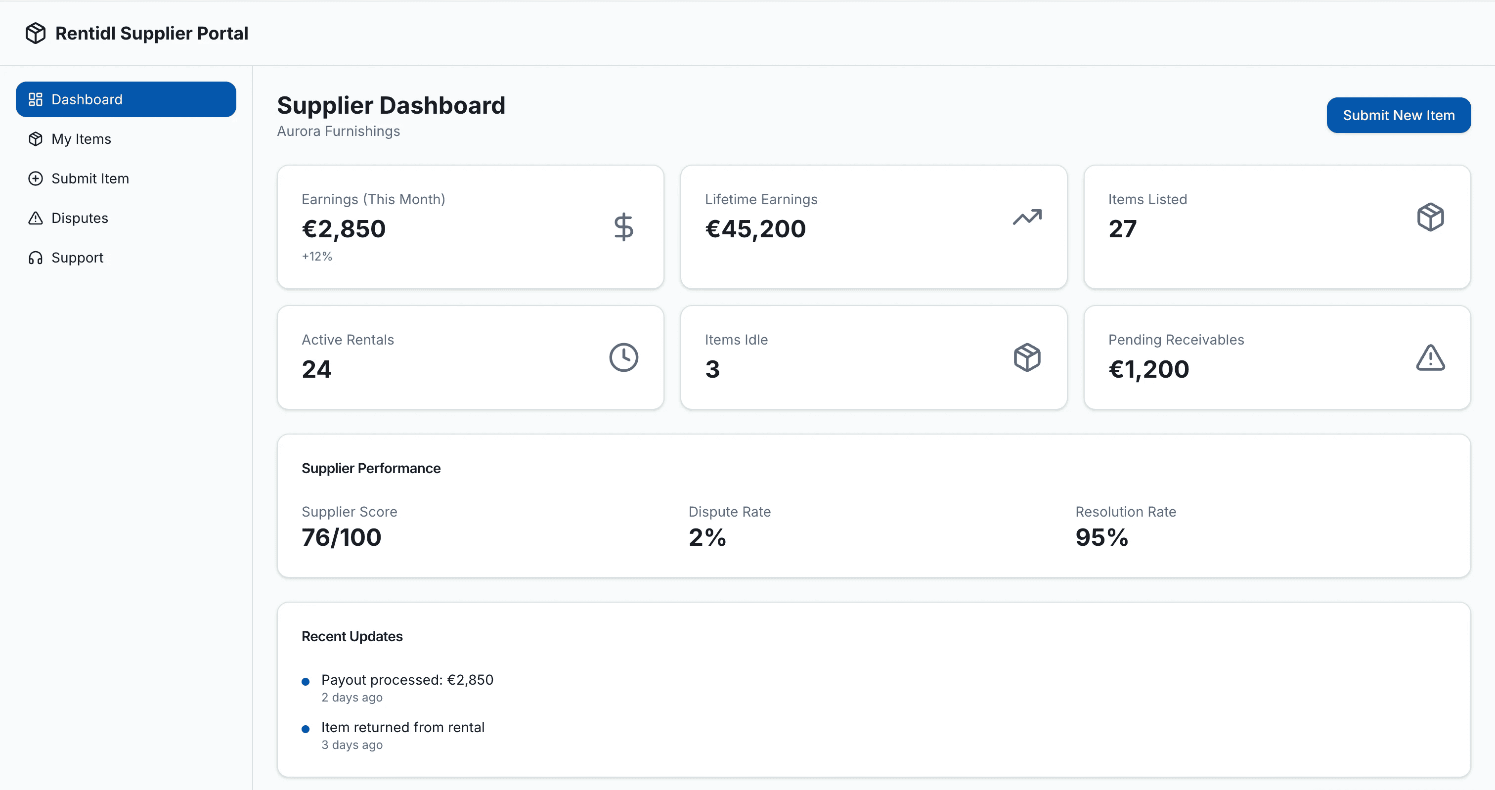 Rentidl manages customer verification, subscriptions, payments, renewals, and reporting. Suppliers do not need to manage rental operations.